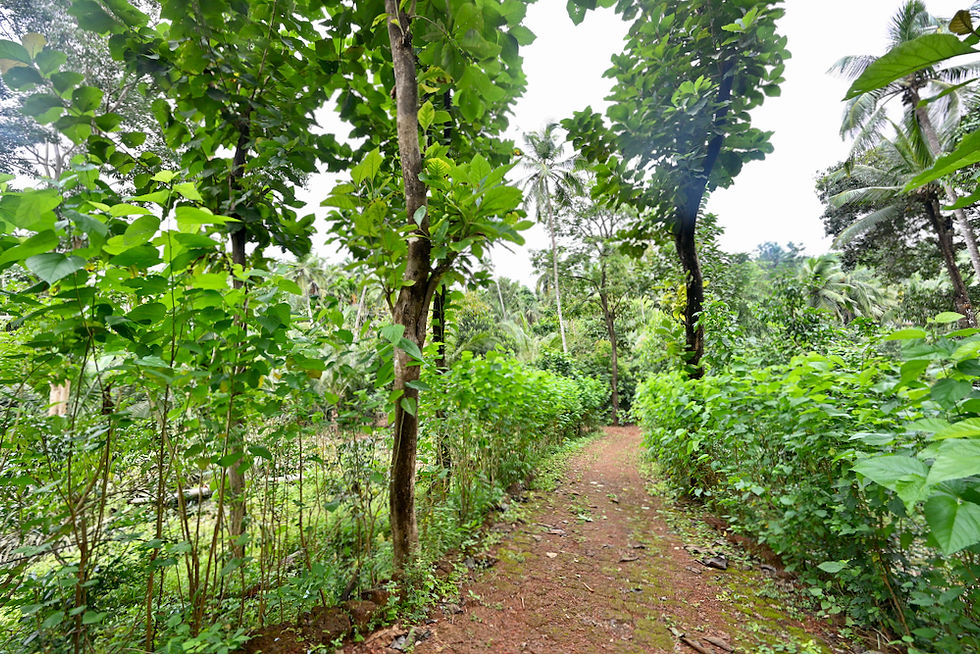There are swatches of many different plants and trees on the way: an appliqué of abundance. Of the 221 species he grows, each of which he can identify readily, I only know coconut, okra, corn, lime, mango, red chilli, turmeric and sindoor.